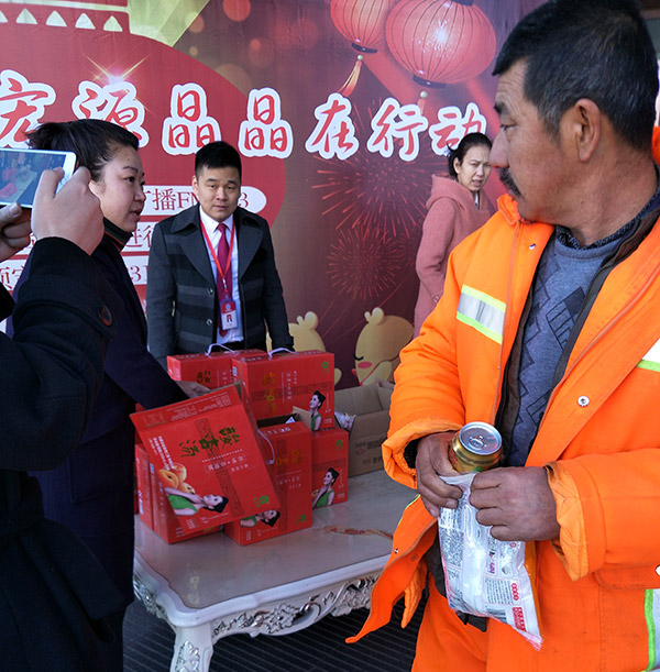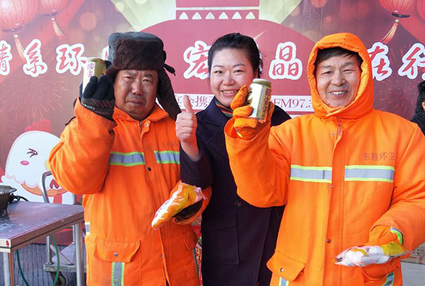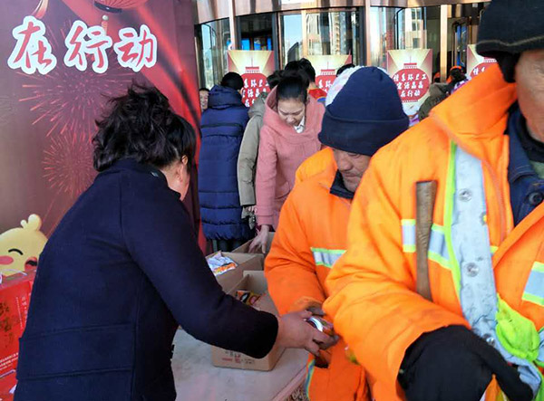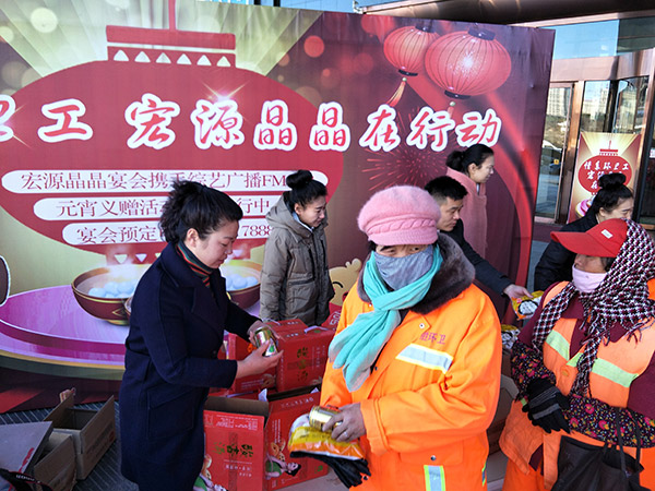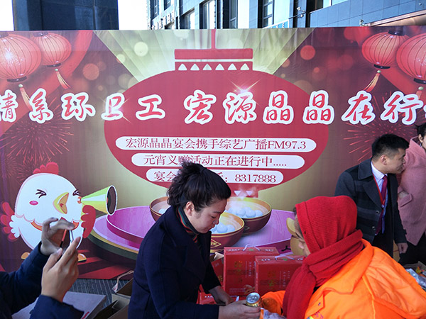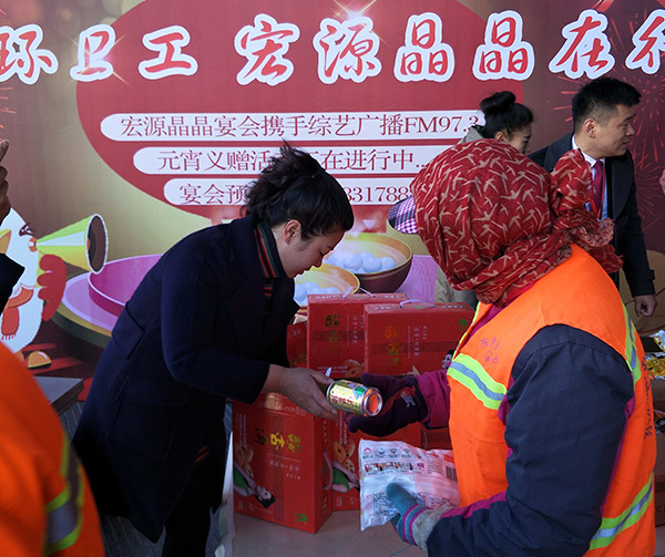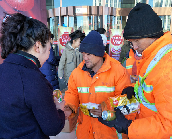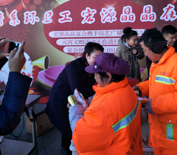 寒冷冬季,環(huán)衛(wèi)工人冒著嚴(yán)寒奮戰(zhàn)在城市的每個(gè)大街小巷,為人們創(chuàng)造一個(gè)優(yōu)美舒適,干凈衛(wèi)生的生活環(huán)境。為了讓奮戰(zhàn)在寒風(fēng)里的環(huán)衛(wèi)工人度過(guò)一個(gè)溫暖的元宵節(jié),2月10日上午,高原杏仁露的工作人員為鄂爾多斯市區(qū)數(shù)百名城市環(huán)衛(wèi)工發(fā)放了高原杏仁露、湯圓等慰問(wèn)品,為他們送去了元宵節(jié)祝福。