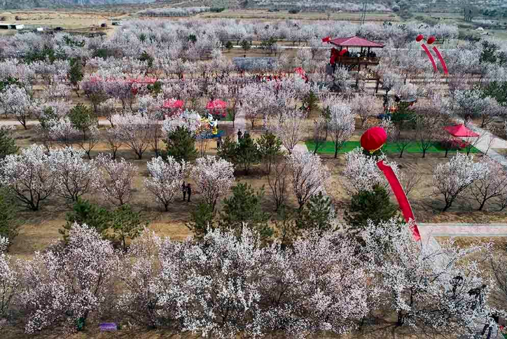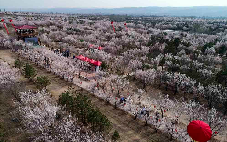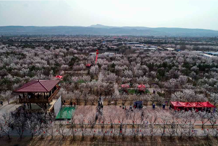 2021年4月9日,無人機在鄂爾多斯市準格爾旗第六屆鄉(xiāng)村旅游杏花季活動中拍攝的杏樹林。(攝影:王正)
