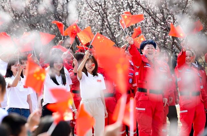 2021年4月9日,游客在鄂爾多斯市準格爾旗第六屆鄉(xiāng)村旅游杏花季活動中參加《愛我中華》快閃。(攝影:王正)