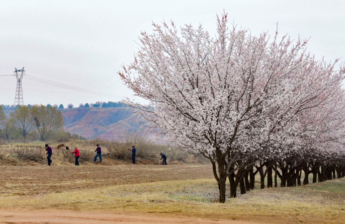 4月11日,內(nèi)蒙古一家食品公司的工人在山杏樹種植基地栽種杏樹。