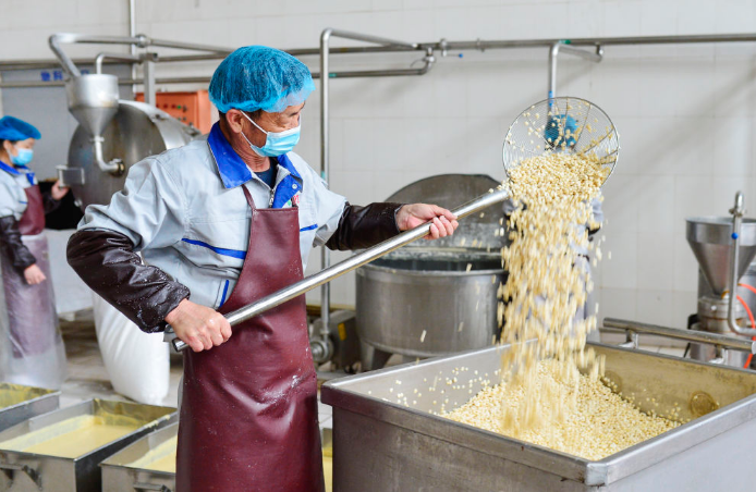 4月11日,內(nèi)蒙古一家食品公司的工人在山杏加工生產(chǎn)線上工作。